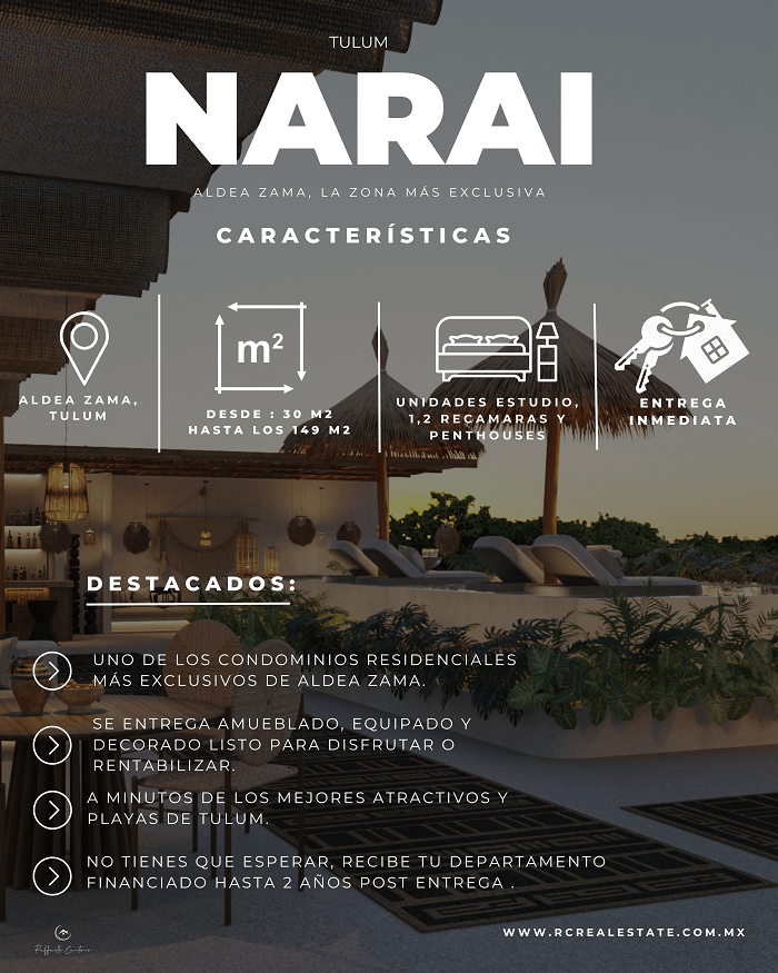 Narai, ubicado en la exclusiva comunidad residencial de Aldea Zamá, Tulum. Una zona premium con acceso directo a la Avenida Kukulcán, la cual te conecta con las mejores playas y zona hotelera.